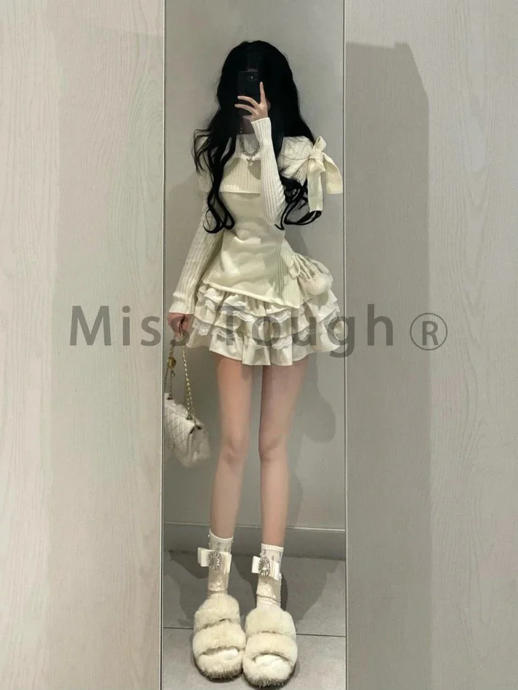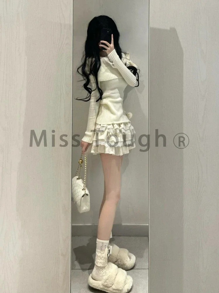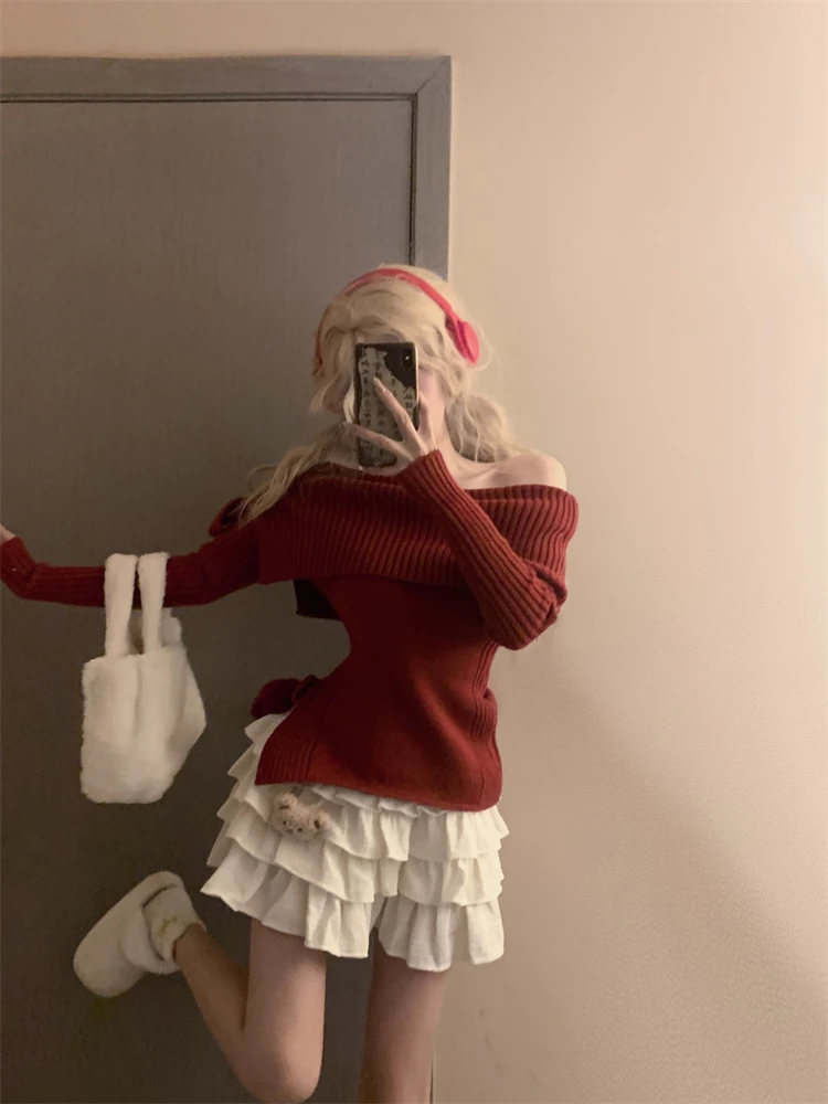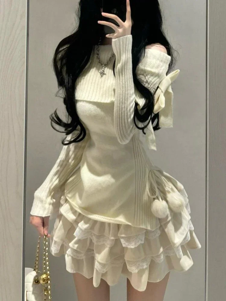 2024년 겨울에는 귀여운 오프숄더 활 니트 상의와 미니 케이크 스커트로 이루어진 세트가 등장했습니다.